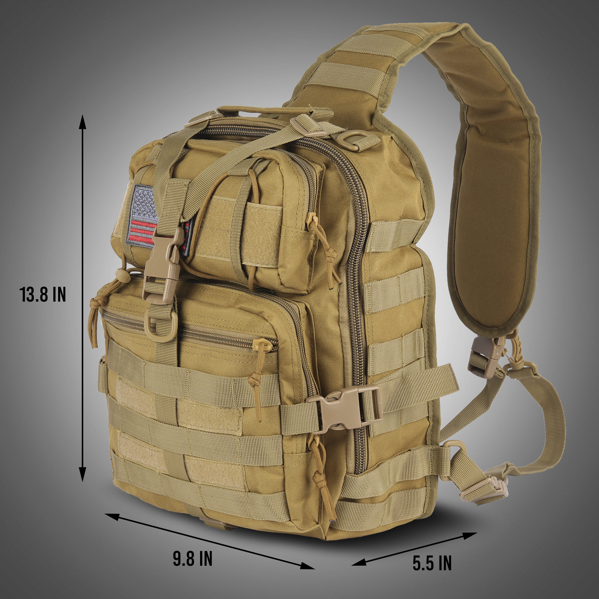 • SMALL & LIGHTWEIGHT: This tactical sling bag measures at 13.75 x 9 x 5 inches and has a volume of about 14 liters. This is the perfect small tactical backpack for men.