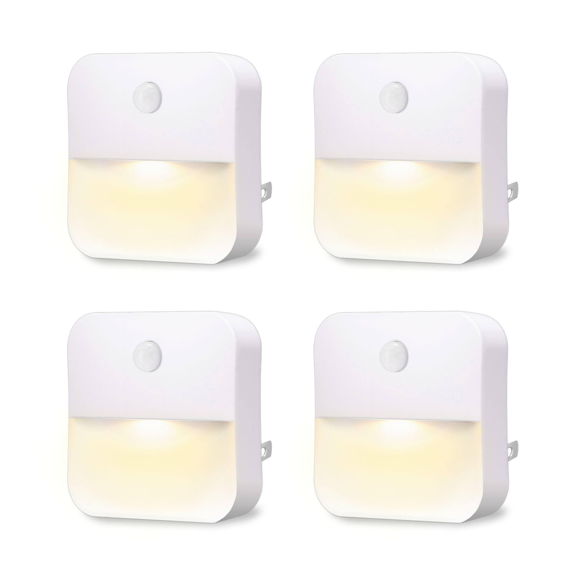 A compact LED night light plug in style with motion sensor. This small movement activated nightlight is great for all rooms in your home including bedroom, bathroom, kitchen, hallway, stairs, closets and more. Now you can easily light-up dark places on demand with the auto-sensor LED night light. This energy-saving night light turns on when it senses motion, giving you 2800K of warm white light with a single watt of energy. Easily plugs into any standard power outlet. No batteries needed.